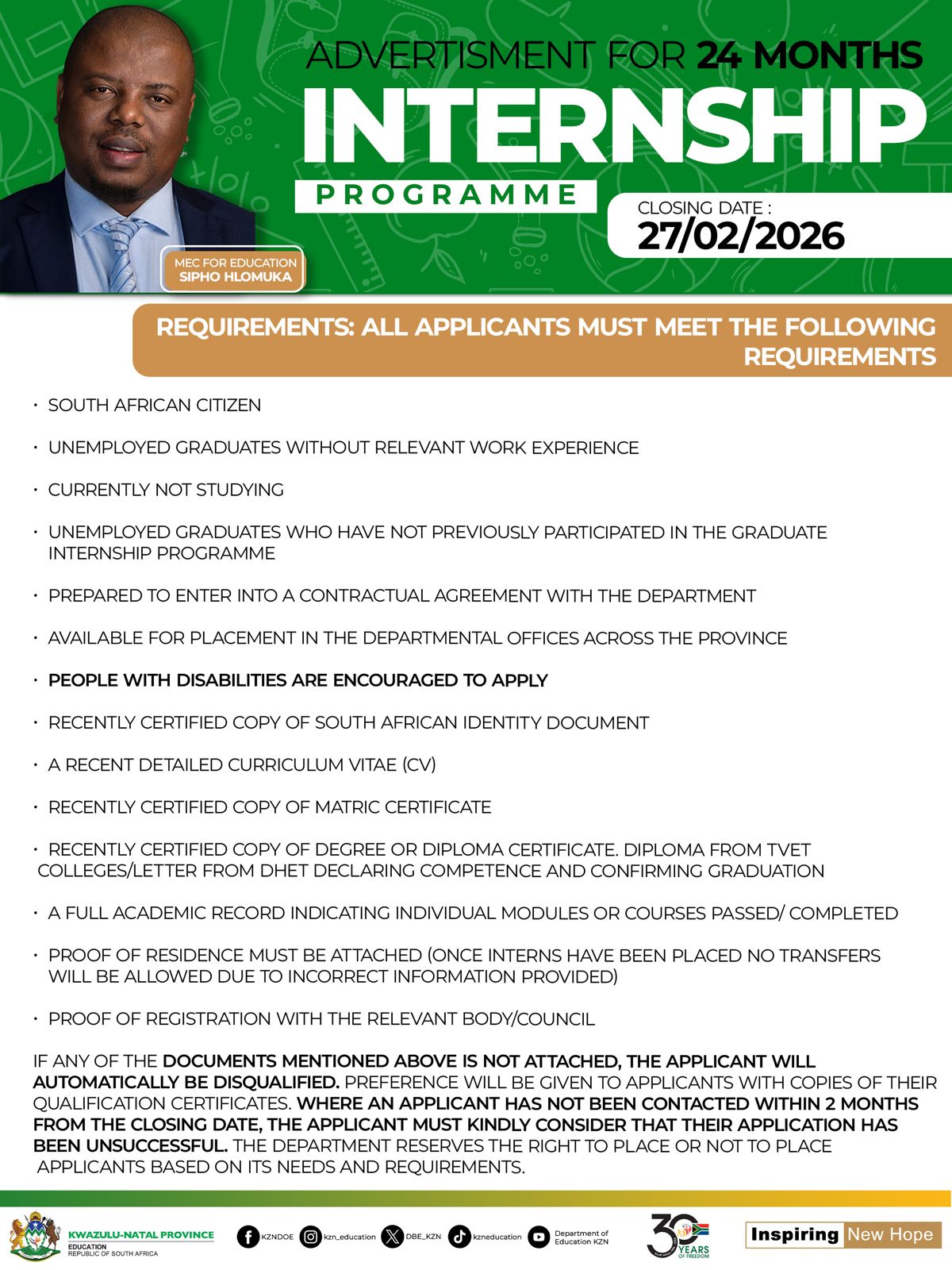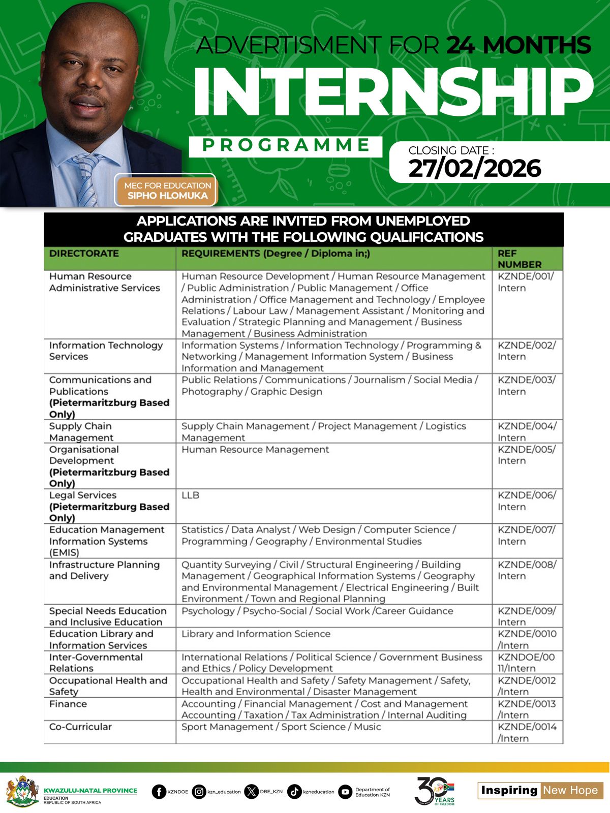 #KZNDOEInternship2026 #GraduateInternshipProgramme #YouthEmpowerment #SkillsDevelopment #PublicServiceCareers #KZNDOE